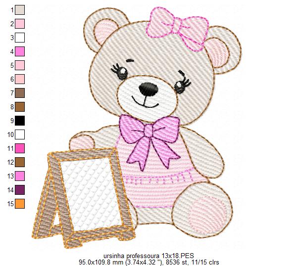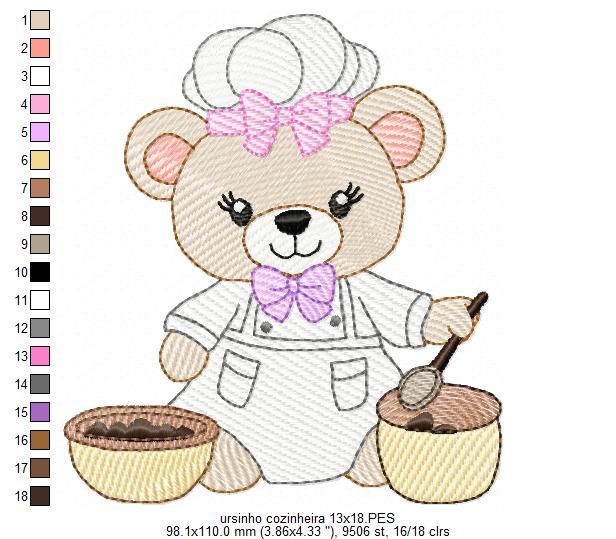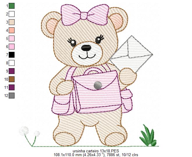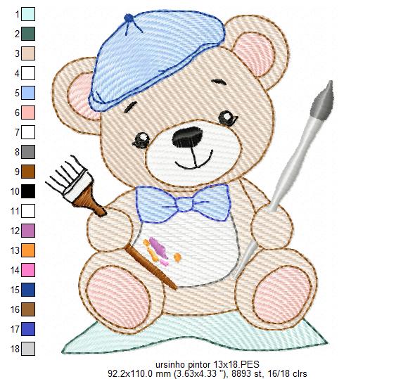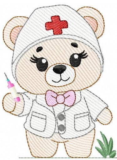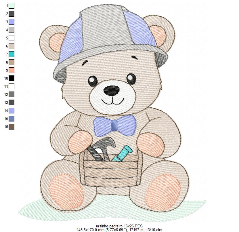 Os ursinhos são desenhados em um estilo fofo e amigável, com traços arredondados e expressões que transmitem simpatia e carisma. Os detalhes incluem roupas e acessórios coloridos, adaptados a cada profissão, criando um visual harmonioso e cheio de vida.