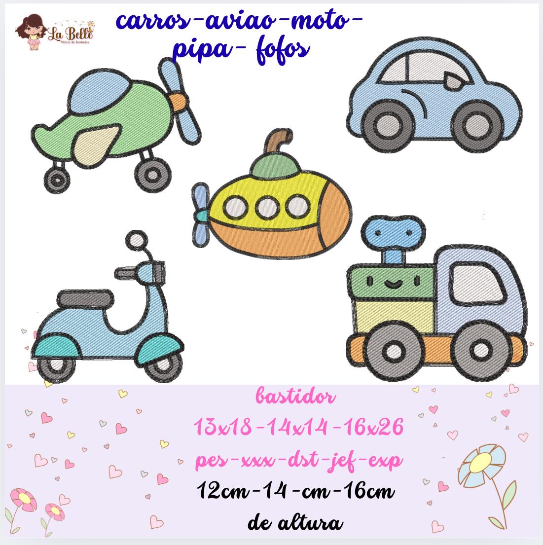 linda  coleção carrinho-moto-avião etc…. pra menino   em pontos leves ,  com 9 matrizes, linda e fofas com toque   delicado e charmoso, bem infantil. ideal pra bordar fraldas, toalhas, caderneta de vacinação, bolsas etc..